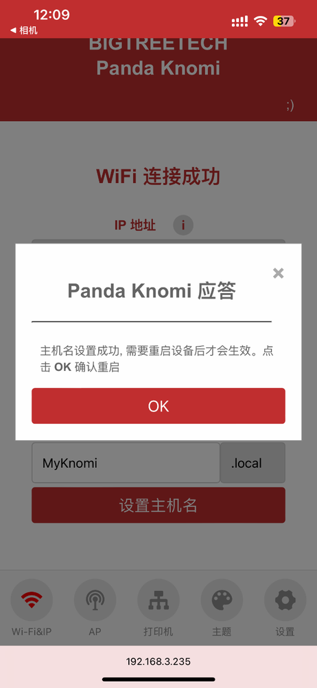 192.168.4.1, 如果您的路由器也使用此号段,Panda Knomi 会无法连接到打印机,需要将 Panda Knomi 设置为与路由器不同的号段,例如:192.168.5.1。设置完成后需要重启设备才生效。 - 修复:打印机断电续打后,Panda Knomi 一直显示 homing GIF。