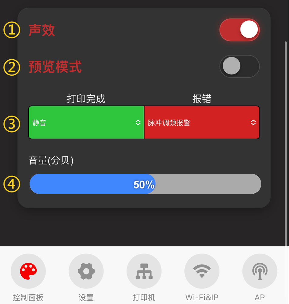 ② “预览模式”:用于预览设备的“音效”。当此模式打开并选择“模拟状态”时,设备将根据所选结果显示相应的“音效”。