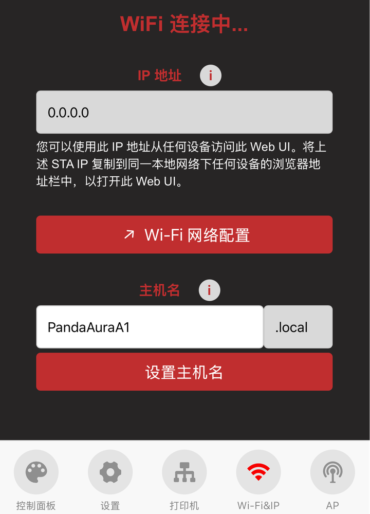⑥ 主机名显示,您可以使用主机名访问 Web UI。默认主机名为: PandaAura。如果您不记得 IP 地址,可以在浏览器地址栏中输入主机名加上 .local 访问 Web UI (例如: http://PandaAura.local)。点击文本框可以编辑主机名, 点击 设置主机名 按钮确认修改