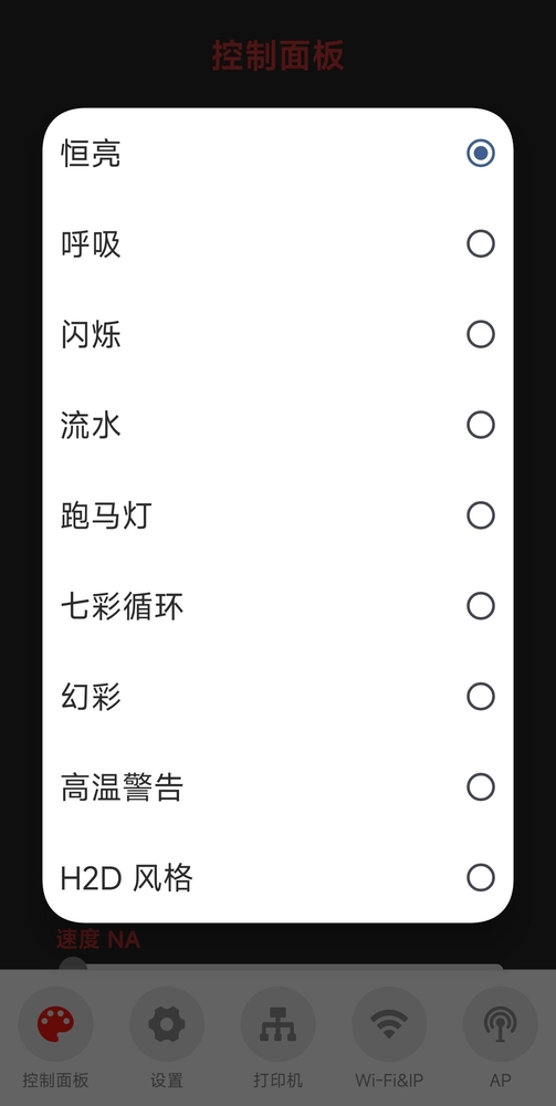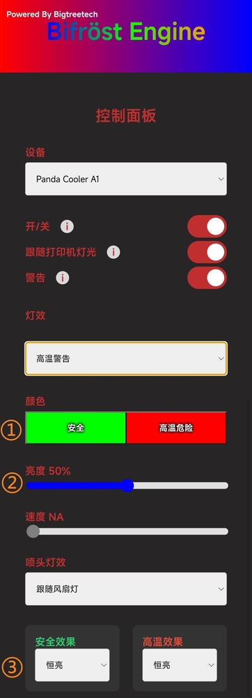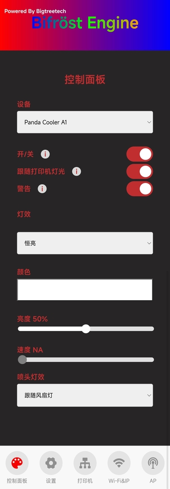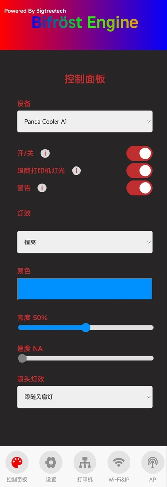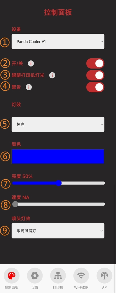 - 开启此开关后,在绑定打印机、网络正常、总开关开启的情况下,打印机出现故障后,Panda_Cooler_A1 会自动启动故障灯效(红色爆闪),此时会覆盖自定义的其他灯效。
