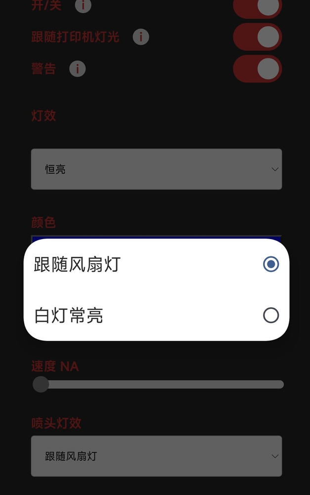 点击喷嘴灯效可出现两个选项(跟随风扇灯光以及白灯常亮)