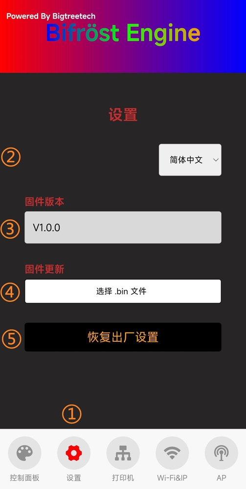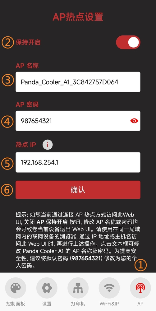 ⑤ :热点IP(默认的热点 IP 为: 192.168.254.1, 如果您自己路由器的 IP 号段也为 192.168.254.xxx, Panda Cooler A1 与路由器的 IP 号段相同就会产生冲突, 并且导致 Panda Cooler A1 无法正常绑定到打印机, 请手动修改 Panda Cooler A1 的热点 IP 使其与路由器使用不同的 IP 号段)
