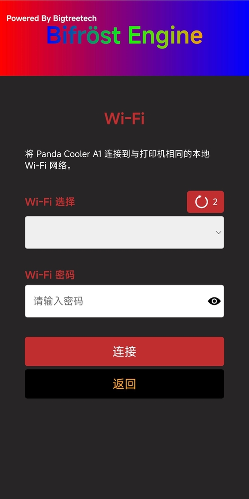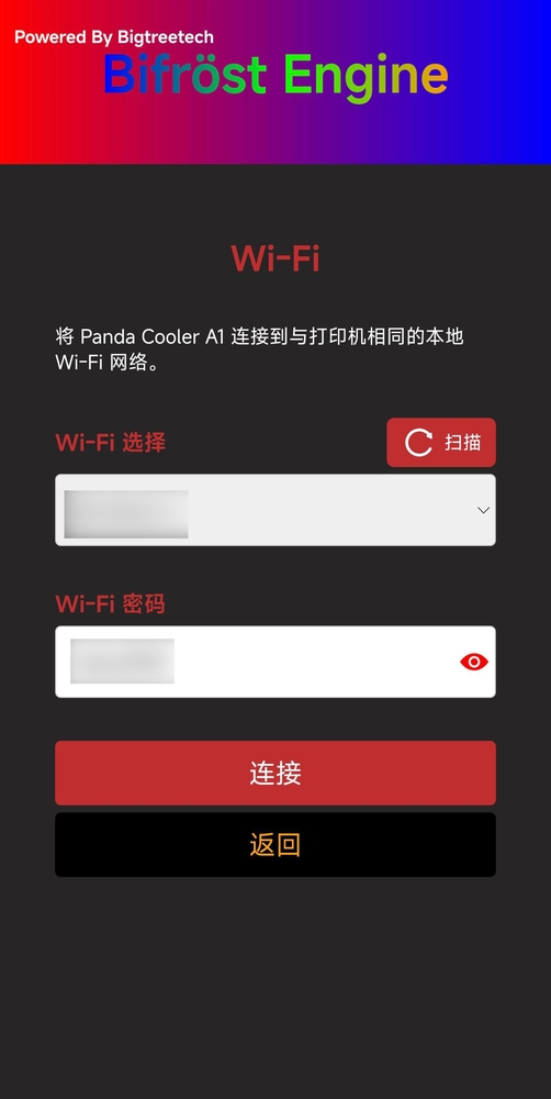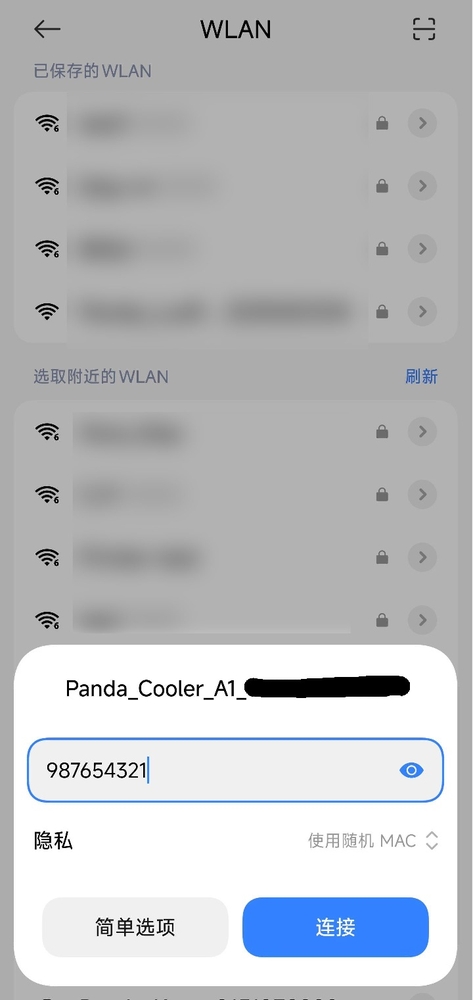 Panda_Cooler_A1_XXXXXXXXXX,AP密码:987654321(出厂默认密码)找到对应热点,输入密码: