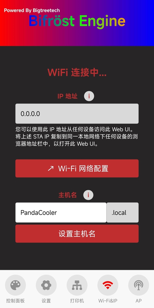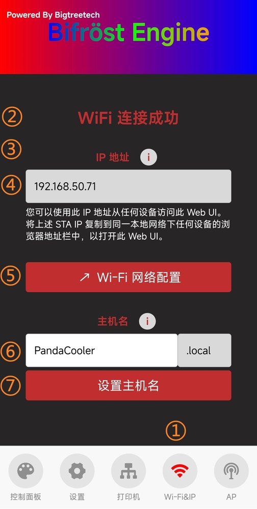 ⑥ :主机名显示,您可以使用主机名访问 Web UI。默认主机名为: PandaCooler。如果您不记得 IP 地址,可以在浏览器地址栏中输入主机名加上 .local 访问 Web UI (例如: http://PandaCooler.local)。点击文本框可以编辑主机名, 点击 设置主机名 按钮确认修改
