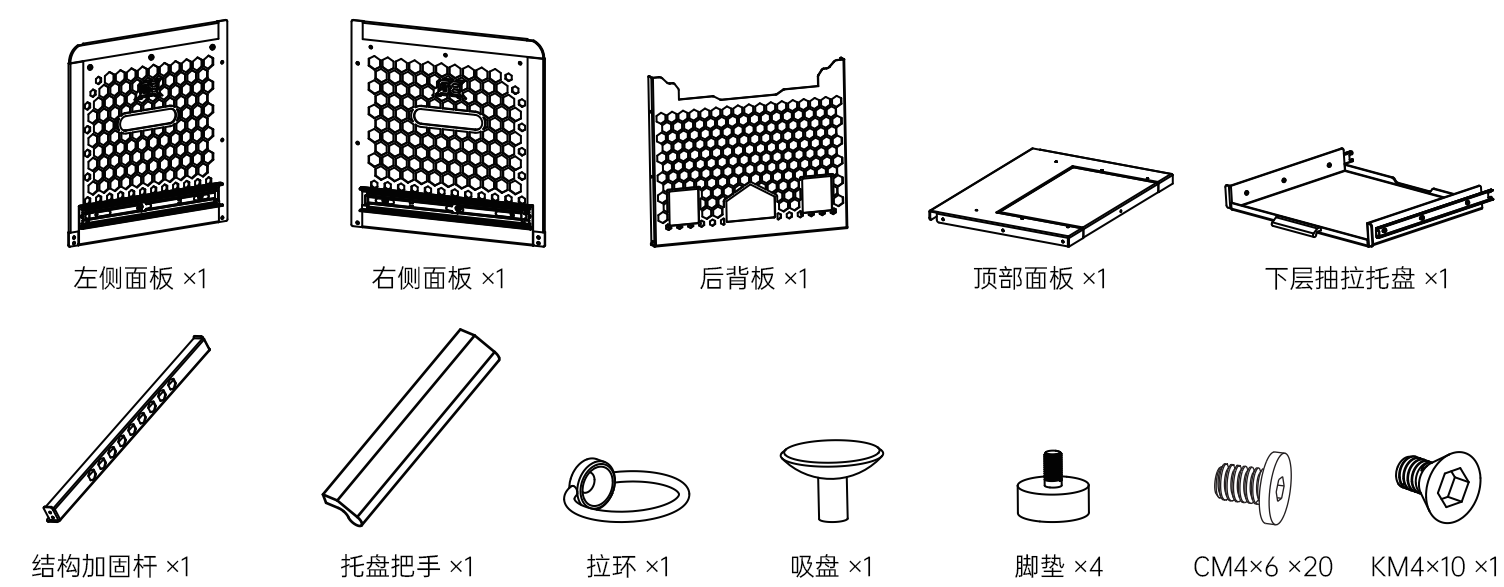 第二步,拿出配件包中的拉环,使用CM4×10螺丝固定到顶层置物板可抽动方向的螺丝孔中
