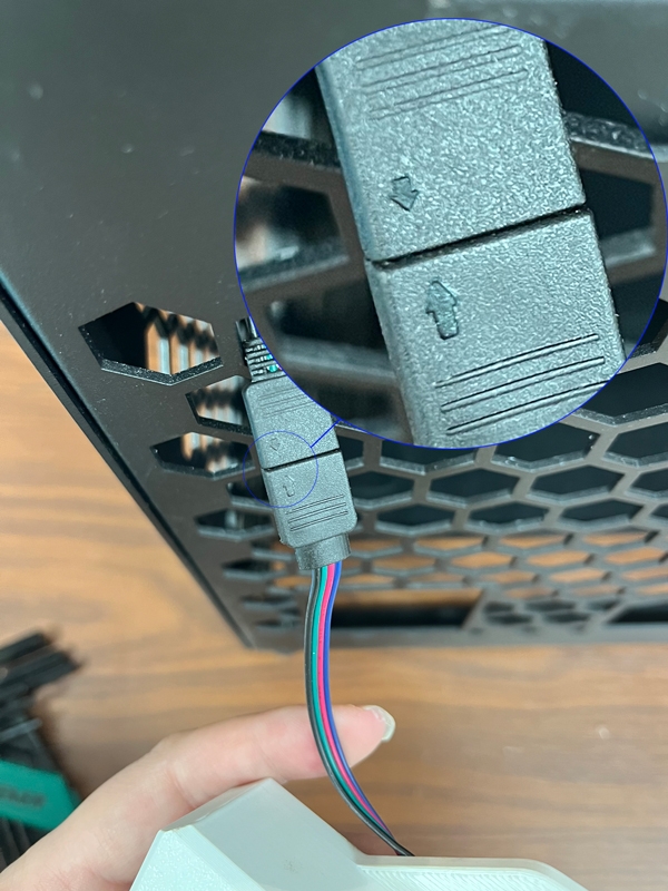 - 将步骤一中插好的控制盒 4-pin 线与灯条插口连接,确保端子上标记的两箭头相对,如图所示。