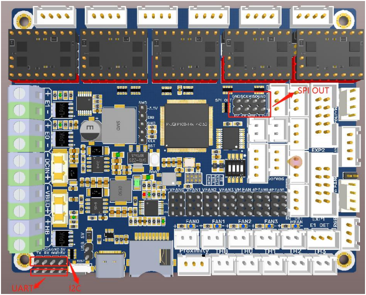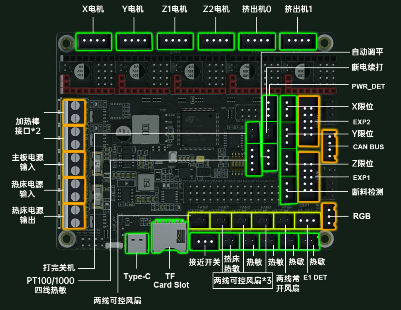 | 拓展接口 | BLTouch(Servos、Probe)、PS-ON、PWR-DET、Fil-DET、RGB、CAN-FD、SPI、UART、I2C |