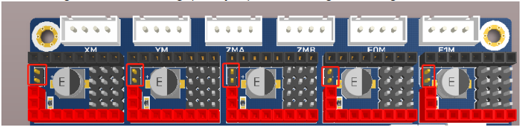 TMC 驱动的 UART 模式:(如:TMC2208、TMC2209、TMC2225 等)每个轴使用一个短路帽短接图中红框位置即可,细分和驱动电流通过固件进行设置。